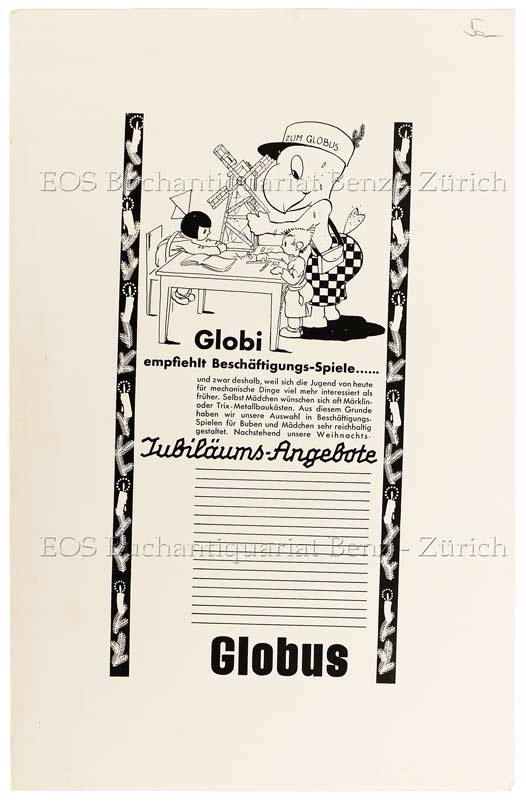 Globi. – Lips, Robert (1912-1975): Globi empfiehlt Beschäftigungs-Spiele … Zürich, Globus, um 1932. Blattgrösse: 38.5 x 25 cm.