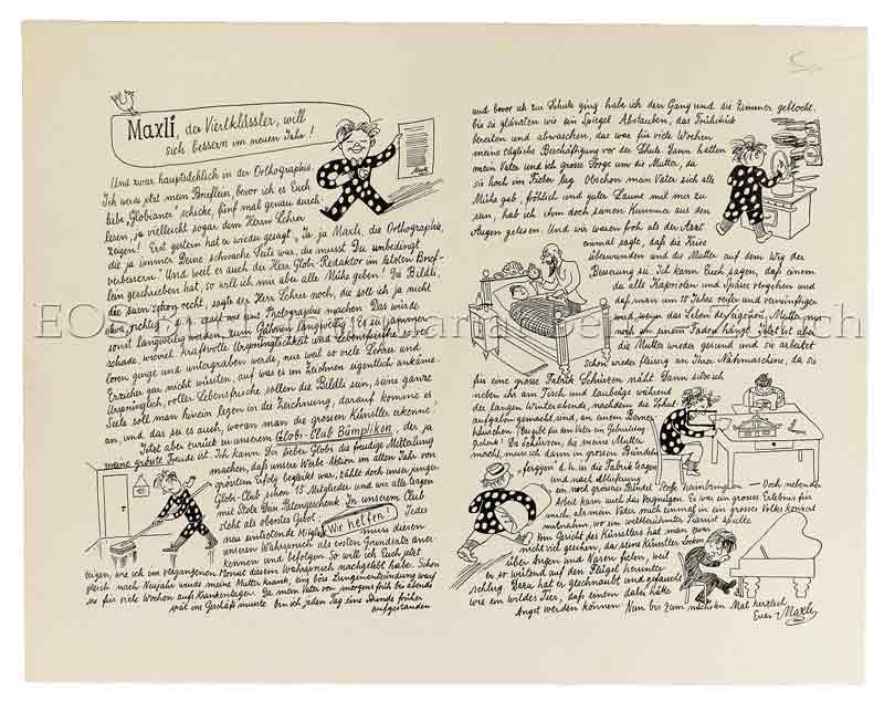 Globi. – Lips, Robert (1912-1975): Maxli, der Viertklässler, will sich bessern im neuem Jahr! Zürich, Globus, um 1932. Blattgrösse: 28.5 x 35.5 cm.