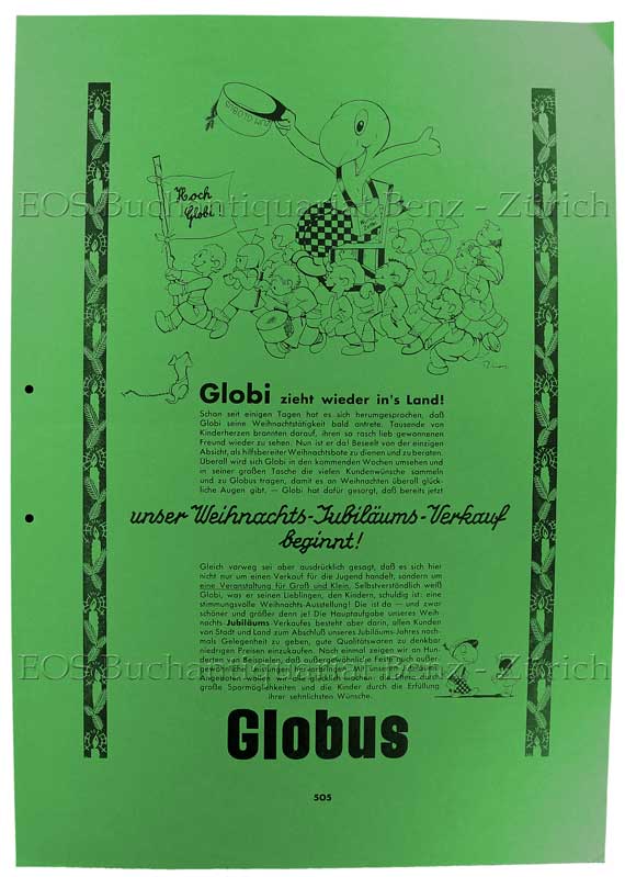 Globi. – Lips, Robert (1912-1975): Unser Weihnachts-Jubiläums-Verkauf beginnt! (Nr. 505). Zürich, Globus, um 1932. Blattgrösse: 54 x 38 cm.