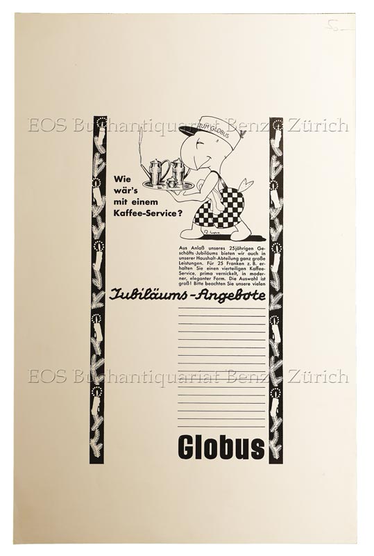 Globi. – Lips, Robert (1912-1975): Wie wär’s mit einem Kaffee-Service? Zürich, Globus, um 1932. Blattgrösse: 38.5 x 25 cm.