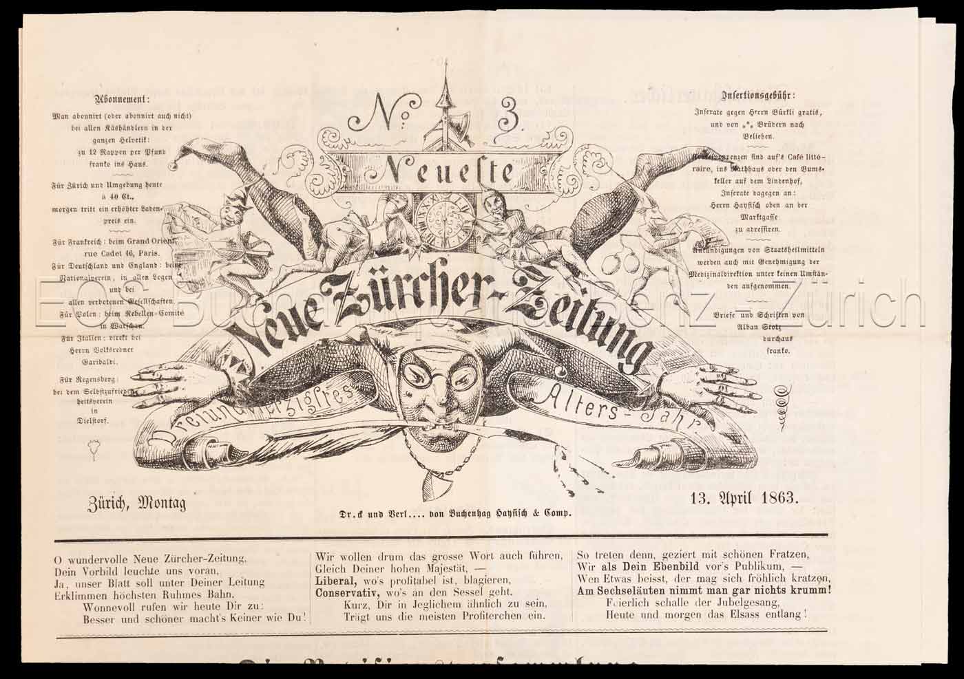Sechseläuten. – Neueste Neue Zürcher-Zeitung. Dreiundvierzigstes Altersjahr. Zürich, Montag 13. April 1863. – No° 3. Zürich, Buchenhag Hayfisch & Comp., 1863. (4) S., gef. mit Illustr. Format: 40 x 28 cm.
