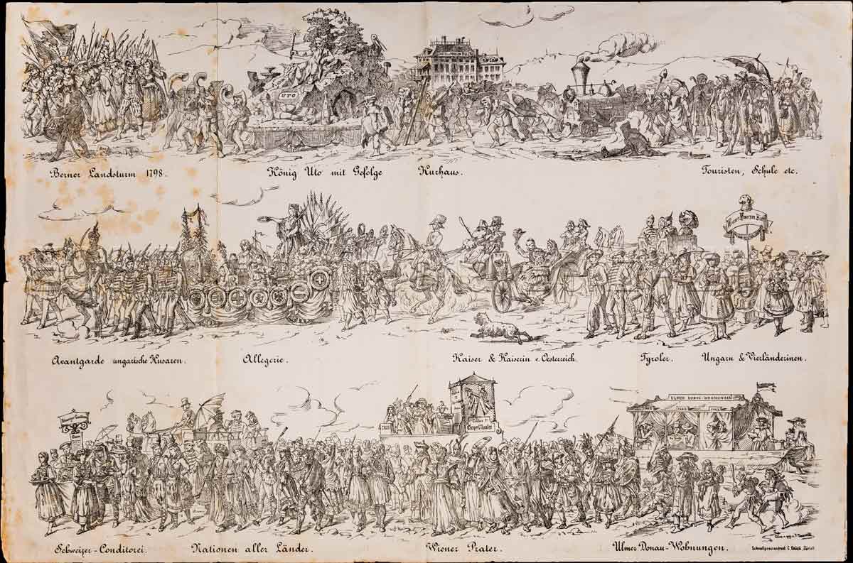 Vgl. Honegger S. 38 (Programm für den Jugend-Umzug von 1873). – Ausschnitt des Umzuges mit 13 Gruppen in 3 Reihen (Berner Landsturm 1798, König Uto mit Gefolge, Kurhaus, Kaiser u. Kaiserin von Österreich, Tyroler, Wiener Prater, Ulmer-Donau-Wohnungen u. a.). – Leicht gebräunt u. stockfleckig.
