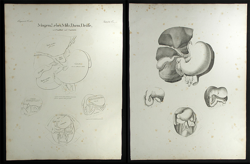 Anatomische Darstellung von Magen, Leber, Milz, Darm und Gallenblase. Heft XX, Tafel 1 u. 2 aus „Oesterreicher’s anatomische Steinstiche. 4. Abtheilung: Eingeweide des menschlichen Körpers“. – Stockfleckig. – Résumé: Part XX, plate 1 and 2 of „Oesterreicher’s anatomische Steinstiche…“. 2 lithographic engravings with 4 illustr. after Sandifort and Santorini showing stomach, liver, milt, intestine and gall bladder (thereof 1 in outlines). – Foxed.