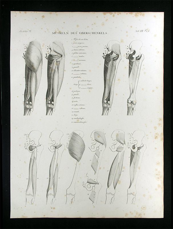 Anatomische Darstellung der Oberschenkelmuskeln. Heft XXI, Tafel 5 aus „Oesterreicher’s anatomische Steinstiche. 3. Abtheilung: Muskeln des menschlichen Körpers“. – Stockfleckig. – Résumé: Part XXI, plate 5 of „Oesterreicher’s anatomische Steinstiche…“. Lithographic engraving with 10 illustr. showing the thigh muscles-anatomy. – Foxed.