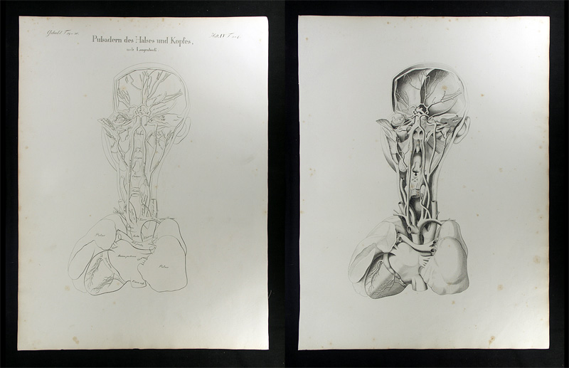 Oesterreicher, Johann Heinrich (1805-1843): Pulsadern des Halses und Kopfes. München, (um 1828). 2 Steingravuren nach (Konrad Johann Martin) Langenbeck (dv. 1 in Umrissen). Bildgrösse: 38 x 19 cm. (picture size). Blattgrösse: 54 x 40 cm. (leaf size).