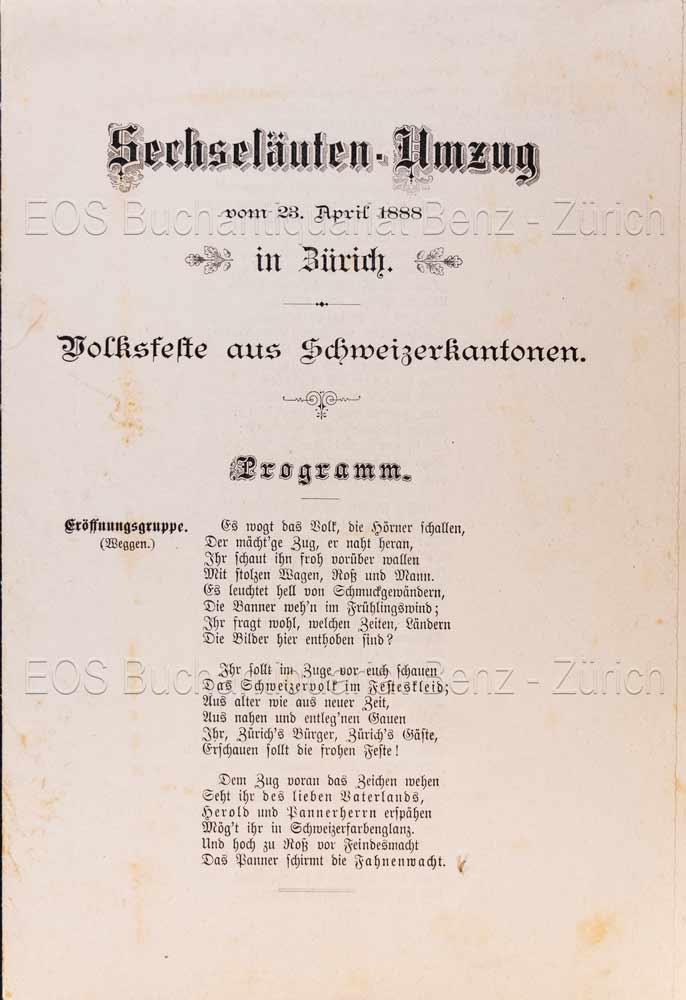 Sechseläuten. – (Programmheft des) Sechseläuten-Umzugs vom 23. April 1888 in Zürich. Volksfeste aus Schweizerkantonen. Zürich, Ulrich u. Co. im Berichthaus, 1888. 15 S. (gef. Bogen).