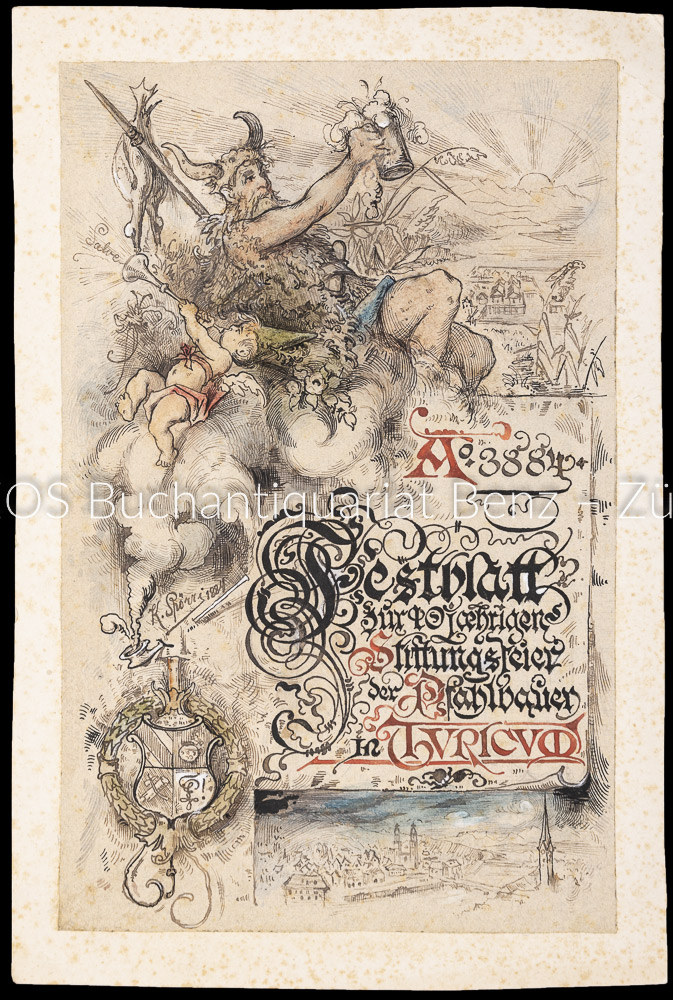 Spörri, K.: Festblatt zur 10jährigen Stiftungsfeier der Pfahlbauer in Turicum.  Zürich, 1884. Kolorierte Tuschzeichnung auf Karton aufgezogen. Blattformat: 26 x 17 cm.
