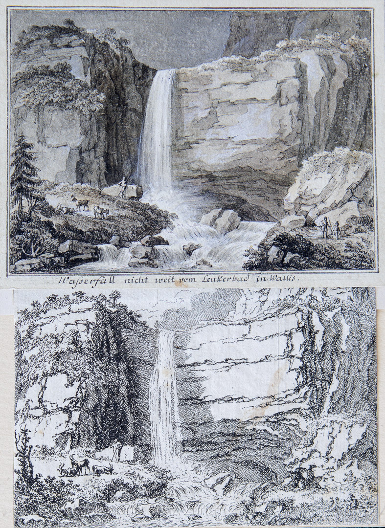 Wasserfall nicht weit vom Leukerbad in Wallis. Aquarell nach Salomon Gessner. 9,2 x 12,5 cm.