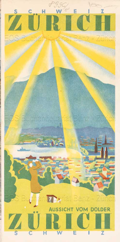 Mehrfach gef. Prospekt mit farbigem Zürichsee-Panorama. Auf der Vorderseite Aussicht über die Stadt und See vom Golfplatz Dolder mit Golfspielerin ab Tee 7. Panorama signiert mit Z 29.